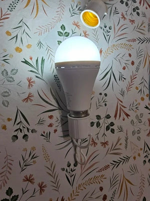 Nice for camping trips and backyard projects — screws into a normal socket, charges while on, and becomes a useful hand lamp when removed.